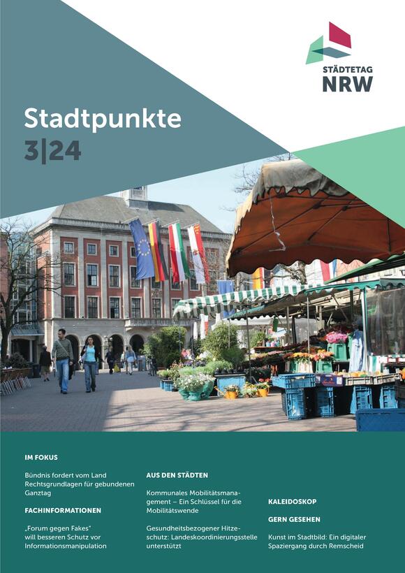 Der Ganztag ist ein Fokus-Thema der neuen Ausgabe der Stadtpunkte: Gemeinsam mit sieben anderen Verbänden spricht sich der Städtetag NRW dafür aus, in Nordrhein-Westfalen die rechtlichen Möglichkeiten für gebundenen Ganztag zu schaffen. Weitere Themen in dem Heft: Kommunales Mobilitätsmanagement und gesundheitsbezogener Hitzeschutz.