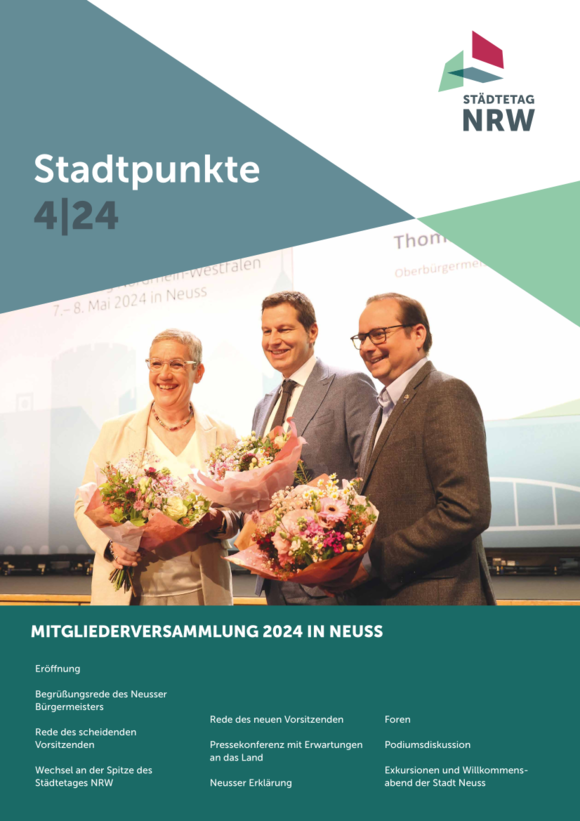 Die aktuelle Ausgabe der Stadtpunkte widmet sich der Dokumentation der Mitgliederversammlung des Städtetages NRW 2024 in Neuss, u. a. mit