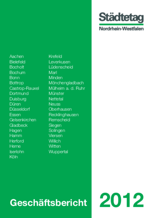 Der vorliegende Geschäftsbericht des Städtetages Nordrhein-Westfalen umfasst die Jahre 2010 und 2011. War die Arbeit des Städtetages im vorangegangenen Berichtszeitraum (2008-2009) bereits geprägt durch eine dramatische Finanzlage der Kommunen, so hat sich die Situation in den beiden letzten Jahren eher nochmals verschärft denn entspannt. Den Kommunen droht die Handlungsunfähigkeit. Der von der Landesregierung im Berichtszeitraum verabschiedete "Stärkungspakt Stadtfinanzen" ist daher als ein erster Schritt in Richtung Stärkung der kommunalen Finanzen anzusehen, aber auch diese Maßnahme kann nicht darüber hinwegtäuschen, dass damit die Ursache der kommunalen Finanzmisere, nämlich die strukturelle Unterfinanzierung der Kommunen in Nordrhein-Westfalen, keinesfalls beseitigt ist.