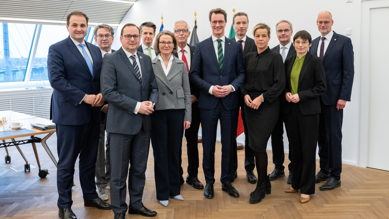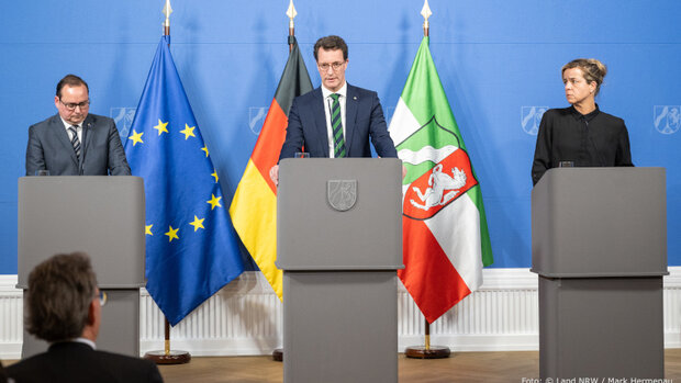 Thomas Kufen als Vertreter der kommunalen Spitzenverbände, Ministerpräsident Hendrik Wüst und Mona Neubauer, stellvertretende Ministerpräsidentin, stellten im Rahmen einer Pressekonferenz die Ergebnisse des Gesprächs vor.