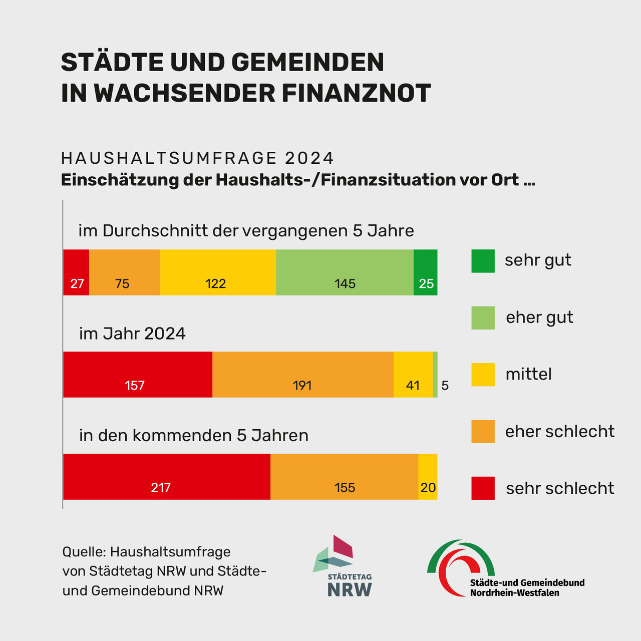 Die finanzielle Lage der Städte und Gemeinden in NRW verschlechtert sich dramatisch. Ausnahmslos steuern die Haushalte in die Krise. Fast sämtliche Städte und Gemeinden bewerten die Aussichten bis 2028 als schlecht oder sehr schlecht. Das ist das zentrale Ergebnis der ersten Umfrage unter allen Städten und Gemeinden in NRW. Der Vorsitzende des Städtetages NRW, Oberbürgermeister Thomas Eiskirch, und der Präsident des Städte- und Gemeindebundes NRW, Bürgermeister Prof. Dr. Christoph Landscheidt, warnten: