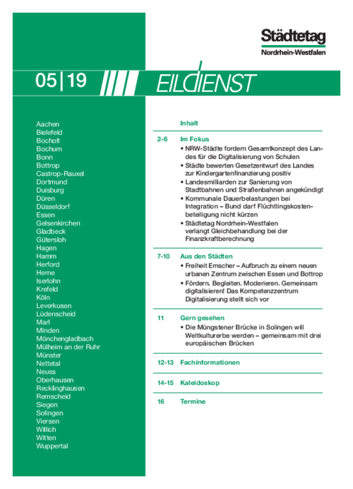 - Städtetag Nordrhein-Westfalen verlangt Gleichbehandlung bei der Finanzkraftberechnung