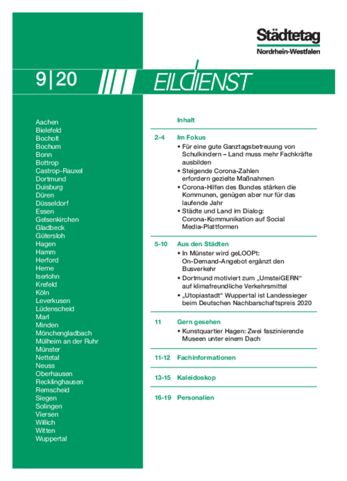 Im Mittelpunkt der Ausgabe stehen u. a. die Forderungen und Empfehlungen des Städtetages an das Land NRW zum Ausbau der Ganztagsbetreuung für Schulkinder.