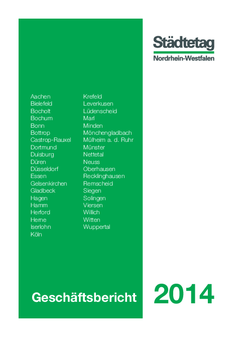 Dokumentation Geschäftsbericht 2014 Die Ausgabe dokumentiert die Schwerpunkte der Arbeit des Städtetages Nordrhein-Westfalen für die Jahre 2012 und 2013.