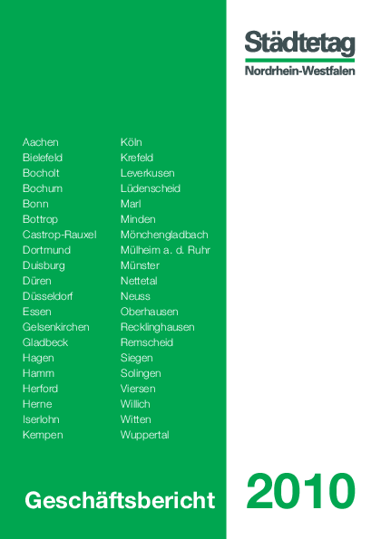 Dokumentation Geschäftsbericht 2010 Die Ausgabe dokumentiert die Schwerpunkte der Arbeit des Städtetages Nordrhein-Westfalen für die Jahre 2008 und 2009.
