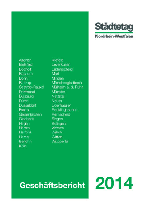 Der vorliegende Geschäftsbericht des Städtetages Nordrhein-Westfalen umfasst die Jahre 2012 und 2013. War die Arbeit des Städtetages im vorangegangenen Berichtszeitraum (2010-2011) geprägt durch eine dramatische Finanzlage der Kommunen, so zeigt sich bei einem Blick auf den haushaltsrechtlichen Status der nordrhein-westfälischen Kommunen zunächst ein Bild der positiven Entwicklung. Die Zahl der Kommunen, die nicht über ein genehmigungsfähiges Haushaltssicherungskonzept verfügten und sich damit im Nothaushaltsrecht befanden, hat sich erheblich reduziert. Da diese positiven Veränderungen im Haushaltsstatus jedoch zum Teil auch auf die Anpassungen der rechtlichen Vorgaben zum Haushaltssicherungskonzept und die Wirkungen des Stärkungspakt Stadtfinanzen zurückzuführen sind, kann trotzdem nicht von einer Entspannung der Haushaltssituation gesprochen werden. Hinzu kommt, dass das Gesamtergebnis der nordrhein-westfälischen Kommunen nicht über eine erhebliche Spreizung der einzelgemeindlichen Finanzmittelsalden hinwegtäuschen darf.