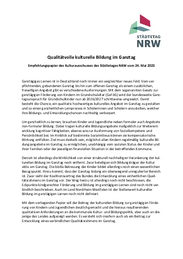 Ein Papier des Kulturausschusses des Städtetages NRW