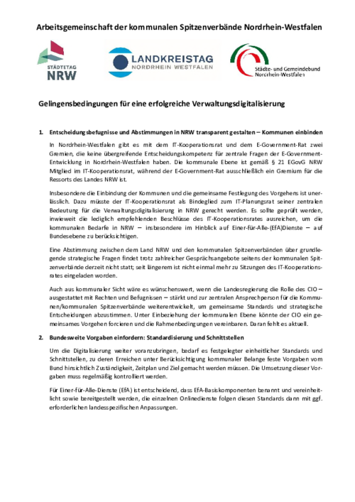Die Städte in NRW haben seit Beginn der OZG-Umsetzung im Jahr 2017 auf die Gelingensbedingungen des Gesetzes hingewiesen. Die zentralen Gelingensbedingungen für die erfolgreiche Umsetzung des OZG und die mittel- und langfristigen Voraussetzungen für eine zukunftsfähige Verwaltungsdigitalisierung in NRW sind in beigefügtem Papier der Arbeitsgemeinschaft der kommunalen Spitzenverbände Nordrhein-Westfalen zusammengestellt.