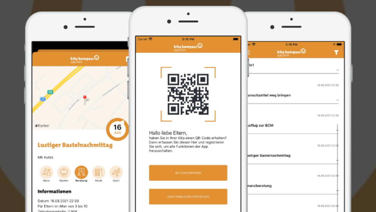 Die Stadt Aachen hat eine App zur Erleichteriung für Eltern, Kita-Personal und Verwaltung erfolgreich erprobt. Der "Kita-Kompass" wurde in drei Pilot-Kitas getestet und soll sukzessive in allen städtischen Tageseinrichtungen für Kinder angeboten werden. Die App verbindet die drei Module: "Kinderbetreuung", "Information und Kommunikation" sowie "Sport- und Bildungsangebote".