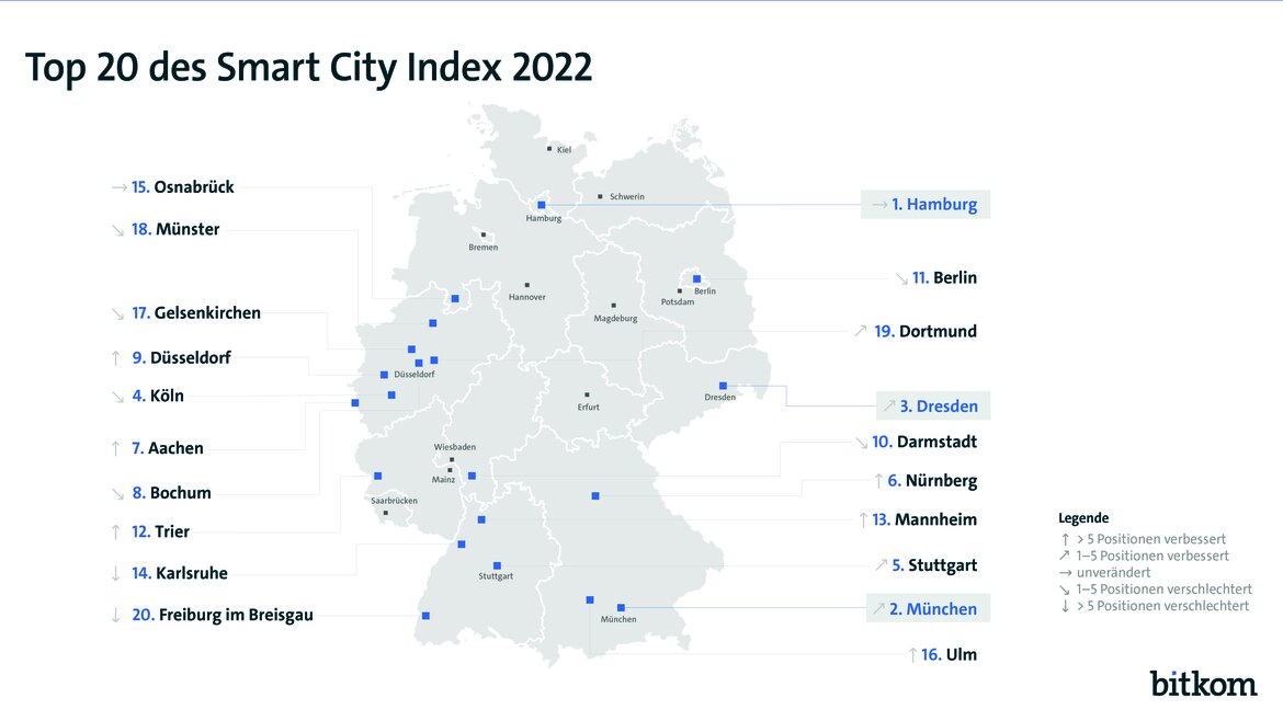 Bei der vierten Erhebung von Bitkom liegt Hamburg wie schon im Vorjahr ganz vorne, büßt aber stark an Vorsprung ein. München holt mit hohem Tempo auf, Dresden schafft es erstmals aufs Treppchen und insgesamt können nahezu alle Nachzügler Boden gut machen:
