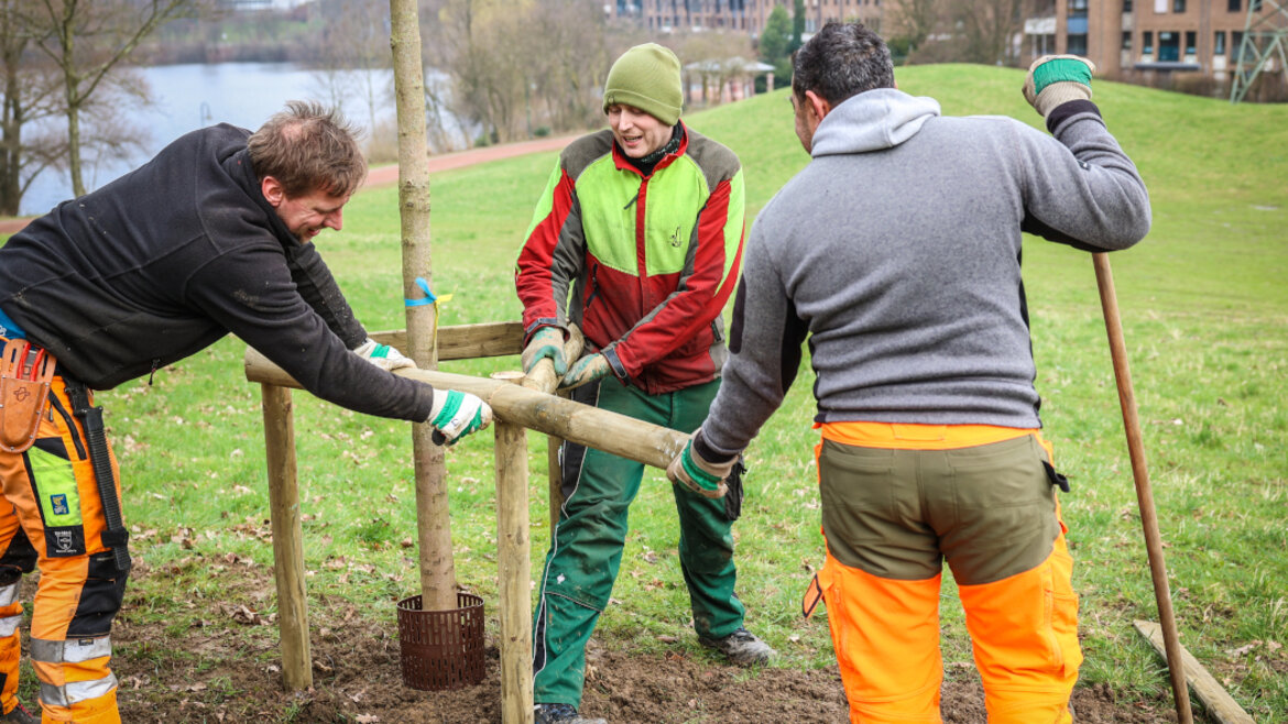 Die Pflanzaktion mit Ehreamtlichen ist Teil des Planungskonzepts "Düsseldorf pflanzt Zukunft", dessen Schwerpunkt auf dem Südpark leigt. Dort haben die Stadtgärtnerinnen und -gärtner 150 Bäume und 14 Großsträucher in die Erde gebracht.