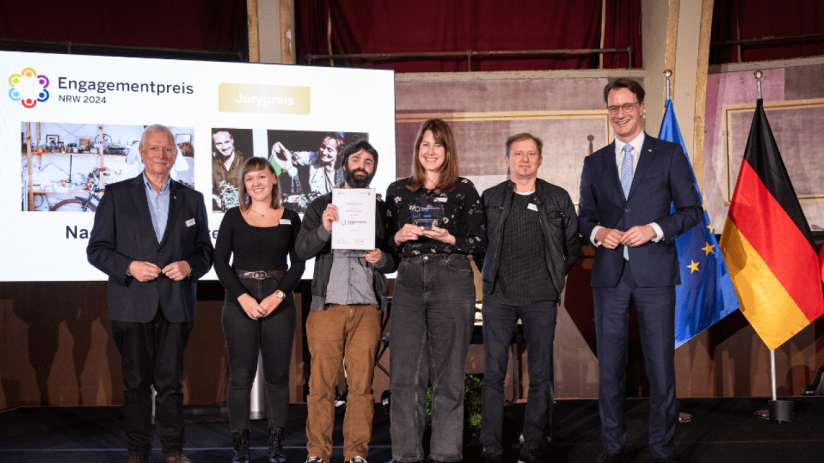 Drei Initiativen aus Mitgliedstädten des Städtetages NRW sind mit dem Engagementpreis NRW 2024 ausgezeichnet worden: das Nachhaltigkeitszentrum Hagen (Jurypreis), das Projekt "Klima ist unser Heimspiel" aus Dortmund (Sonderpreis der Nordrhein-Westfalen-Stiftung) und das Netzwerk Münster nachhaltig (Sonderpreis des Ministeriums für Umwelt, Naturschutz und Verkehr).