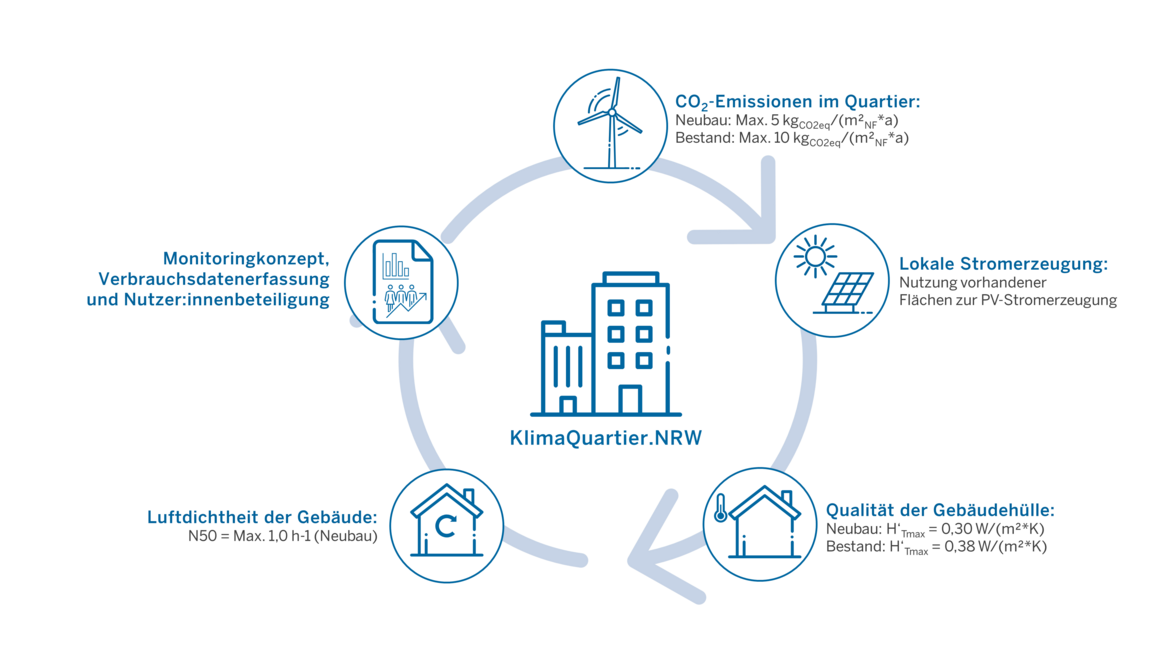 Um die Klimaschutzziele zu erreichen, ist neben dem Ausbau einer nachhaltigen Energie- und Wärmeversorgung auch eine deutlich verbesserte Energieeffizienz erforderlich. Auf den Gebäudesektor entfallen rund 35 Prozent des gesamten deutschen Endenergieverbrauchs – entsprechend groß ist das Einsparpotenzial, insbesondere beim Wärmebedarf. Mit dem Projekt KlimaQuartier.NRW unterstützt die Landesregierung Nordrhein-Westfalen den Bau und die Sanierung von klimafreundlichen Quartieren, um Treibhausgase zu reduzieren. Unter Leitung des NRW-Wirtschaftsministeriums hat eine Fachjury am 17. Juni 2024 drei neue Projekte in Bochum und Köln ausgewählt. Das Land vergibt die Auszeichnung sowohl für Neubauten als auch für die energetische Sanierung von Bestandsbauten – aktuell gibt es 16 ausgezeichnete KlimaQuartiere.NRW im Land.