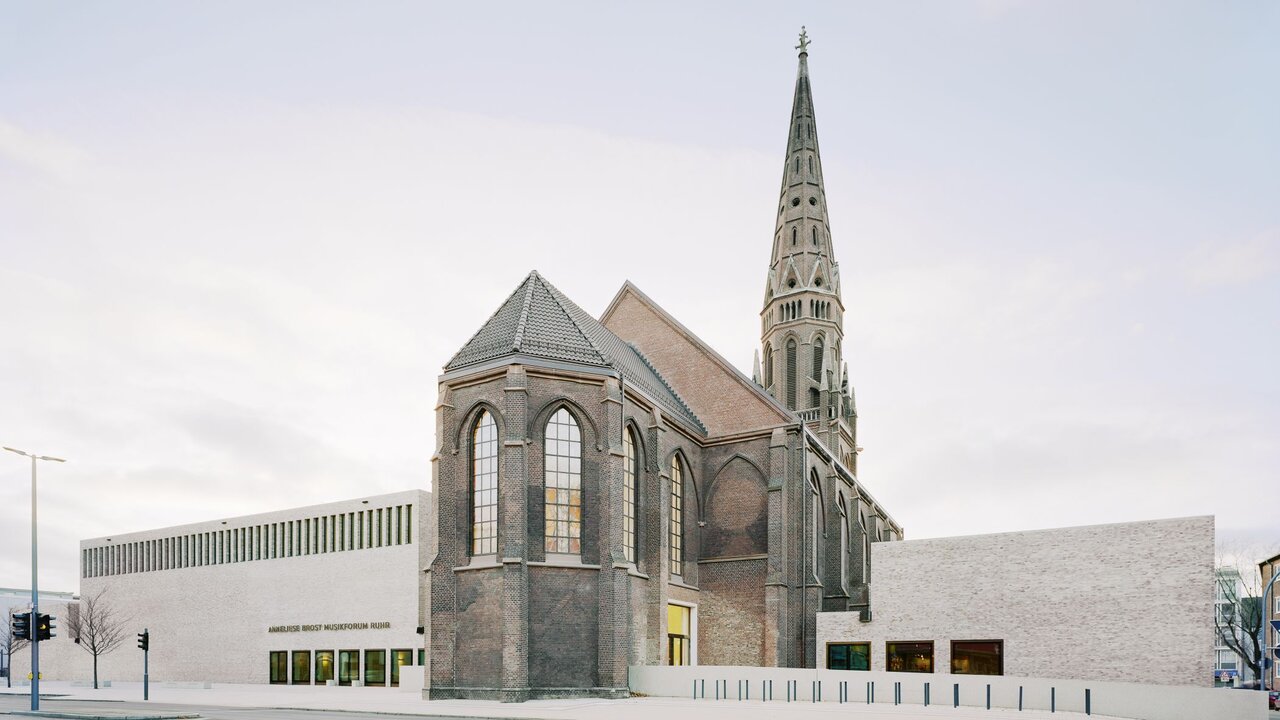 An prominenter Stelle in der Bochumer Innenstadt setzt das Anneliese Brost Musikforum Ruhr seit 2016 ein städtebauliches Zeichen und gibt laut Jury eine überzeugende Antwort auf die Frage, wie Kirchen weitergenutzt werden können. Die planerische Lösung lag nicht gerade auf der Hand: Denn die erhaltene, nicht denkmalgeschützte Kirche von 1872 ließen sie nicht etwa zum Konzertsaal umbauen, sondern zum festlich weiß getünchten Foyer, an das sich zu beiden Seiten die Säle in neu errichteten Anbauten anschließen: der große Saal als Heimat der Bochumer Symphoniker, die zuvor lange Jahre ohne festes Haus auskommen mussten, sowie der multifunktionale kleine Saal, der unter anderem von der städtischen Musikschule bespielt wird. Zu bestimmten Anlässen wird zudem auch der Kirchenraum als Aufführungsort genutzt. Überhaupt erst ermöglicht haben das Projekt viele Förderer und über 20.000 private Spenderinnen und Spender.