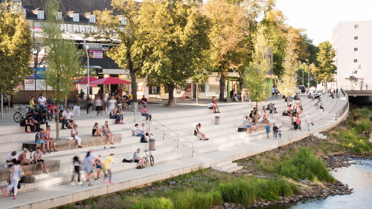 Seit der Nachkriegszeit war die Sieg an in der Siegener Innenstadt von einer als Parkplatz genutzten großen Betonplatte überdeckt. Was an ihre Stelle treten sollte, konnte die Stadtgesellschaft in einem intensiven Beteiligungsverfahren mitbestimmen. So wurde die Sieg im Jahr 2016 freigelegt, mitsamt ihrer brachliegenden Ufer renaturiert und durch eine lange Sitztreppe erschlossen, die zum unangefochtenen Treffpunkt in der Innenstadt geworden ist. Parallel dazu wurde die angrenzende Straße zur Promenade umgestaltet und gewohnte Wegeverbindungen wurden über neue beziehungsweise sanierte Brücken aufrechterhalten. In der Folge hat das Projekt nicht nur Impulse für die weitere Entwicklung der Siegener Innenstadt gesetzt, sondern ist auch zur bundesweiten Referenz für den Umbau unserer Innenstädte geworden.