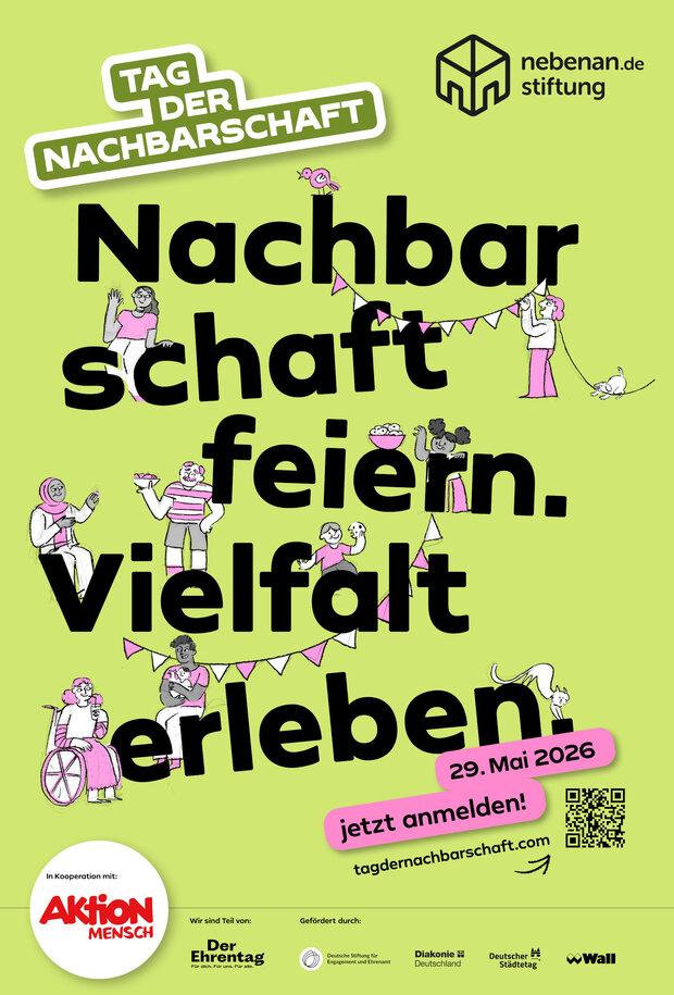 In einigen Ländern Europas wird der "European Neighbour's Day" jedes Jahr Ende Mai gefeiert. Inspiriert von diesem Erfolgskonzept organisiert die nebenan.de Stiftung seit 2018 einen Tag der Nachbarschaft, der ein klares Ziel verfolgt: den nachbarschaftlichen Zusammenhalt in der Gesellschaft zu stärken. Das Motto für 2026 lautet “Lebendige Orte, starke Gemeinschaften”