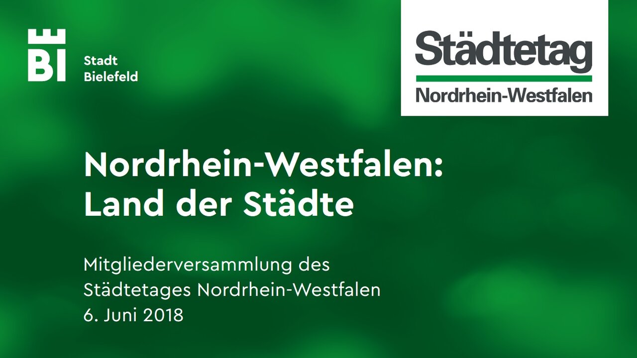 Rund 500 Delegierte und Gäste nahmen am 6. Juni an der Mitgliederversammlung 2018 des Städtetages Nordrhein-Westfalen in der Stadthalle Bielefeld teil. Das Motto der Veranstaltung "Nordrhein-Westfalen: Land der Städte" zeugt vom Selbstverständnis, aber auch vom Selbstbewusstsein der Städte in NRW. Im urbansten Flächenland der Republik spielt sich in den Städten für die meisten Menschen das persönliche, berufliche, kulturelle und gesellschaftliche Leben ab.